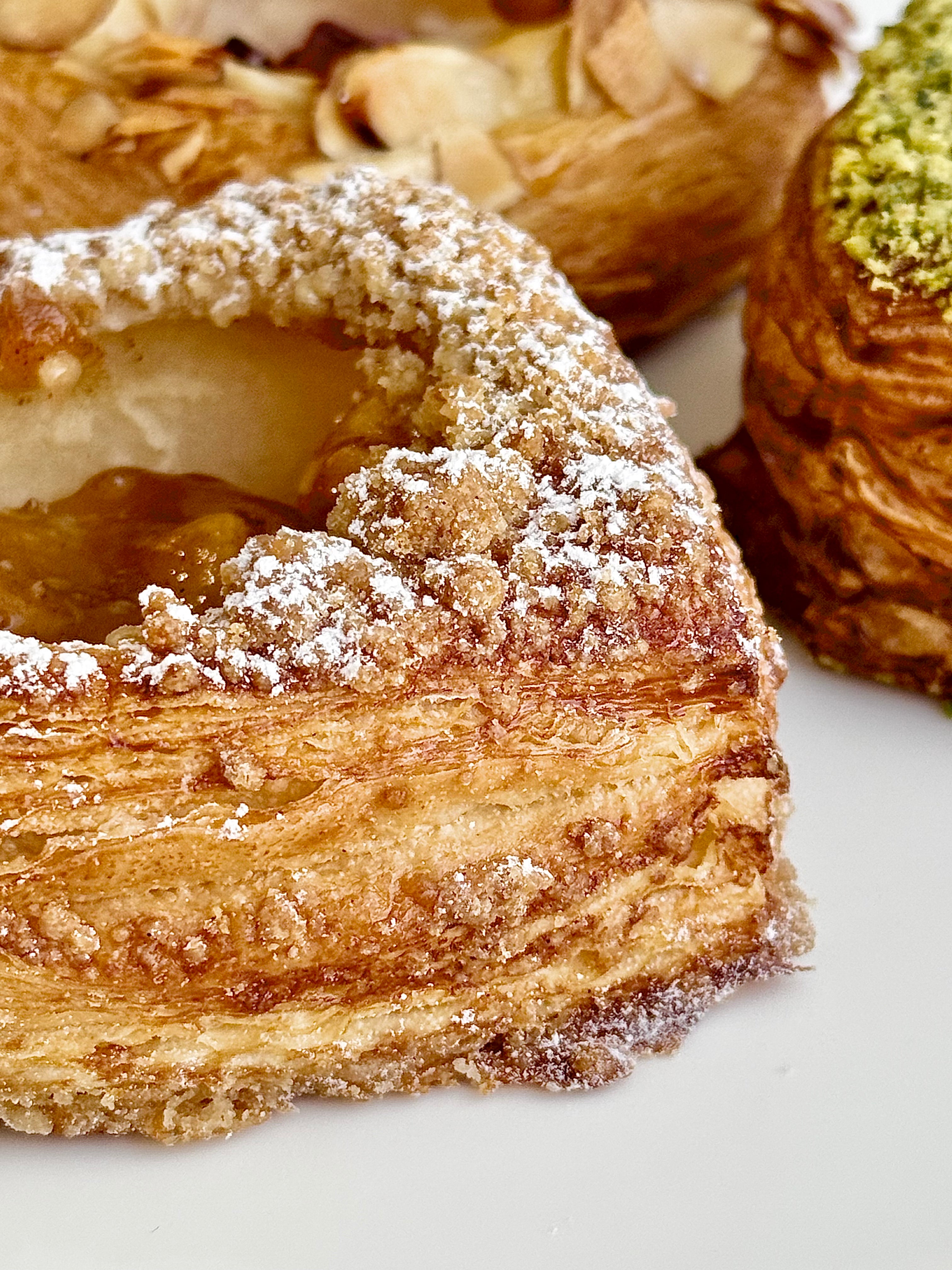 - Crème pâtissèrie topped with rhubarb & raspberry compote, and finished with flaked almonds